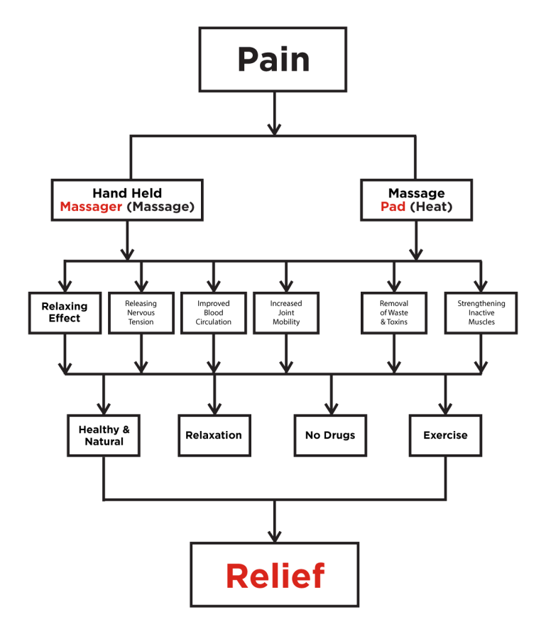 We've developed a detailed diagram that visually explains how heat and massage contribute to the process of pain relief, enriching your understanding of how our Electro Therapy works.